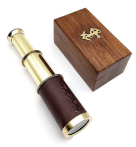 Material: High-quality brass construction with red leather wrapping, glass optics, wooden case